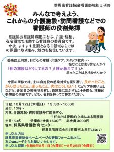 群馬県看護協会看護師職能II研修のご案内 看護職の方向け 研修 2023/07/31 群馬県看護協会看護師職能II研修を開催いたします。介護・福祉、在宅領域で活動する看護職の方を対象にした研修です。 お申し込みはこちら