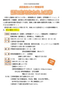 【研修案内】病院勤務以外の看護師等認知症対応力向上研修 看護職の方向け,一般の方向け,研修関連 研修 2023/11/21 令和5年度 病院勤務以外の看護師等認知症対応力向上研修を開催いたします。 詳細は以下のパンフレットをご参照ください。申込はこちら