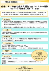 そこで本会では、日本看護協会の研修プログラムを基に在宅療養支援の要となる外来看護職員対象の標記研修を企画いたしました。チラシを参照していただき申し込みしていただきますようお願いいたします。