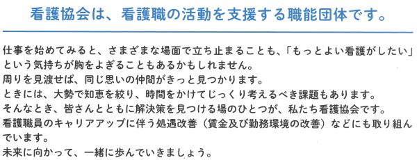 群馬県看護協会は県内の保健師、助産師、看護師、准看護師で構成する看護職の職能団体です。私たちは看護職の資質向上と、県民の皆さんの健康と福祉の増進を目標に活動しています。